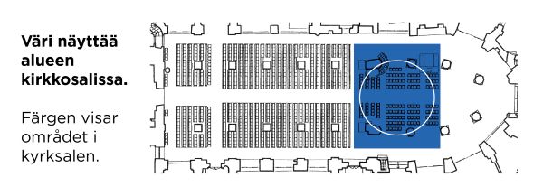 Sininen lippu (35,00 e + mahdollinen käsittelykulu), kirkkosalin etuosan ns. irtotuolit, jotka on sijoitettu historiallisen nuottitelineen ympärille.
